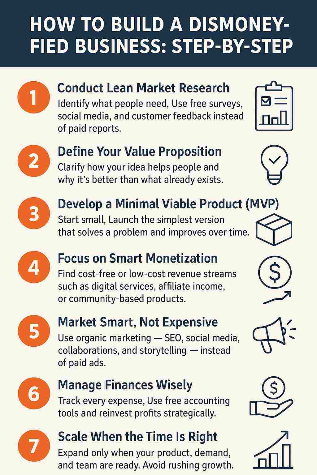 Building a business without relying on big funding requires a clear plan and careful execution. The Business Guide Dismoneyfied approach focuses on starting small, testing ideas, and growing efficiently. Here’s a step-by-step method to create a lean and profitable business: